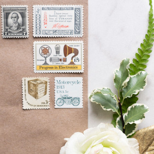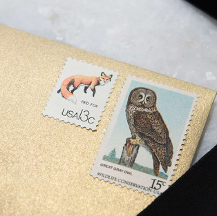 By far my favorite way to add postage to your invitation envelopes is to use vintage, unused stamps. They come in every color and in every denomination from one cent and up. You can mix and match different styles and colors to come up with an effect that works with your color palette. One of my favorite vintage stamp vendors is Virginia Sauder at Verde Studio. You can choose from a variety of themes like history, nature, love, botanicals etc. She can also put packages together for you if you tell her your needs.